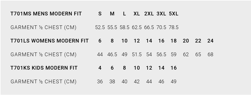 • Small (2T), Medium (3T), Large (4T), X Large (5T), 2X Large (6T)